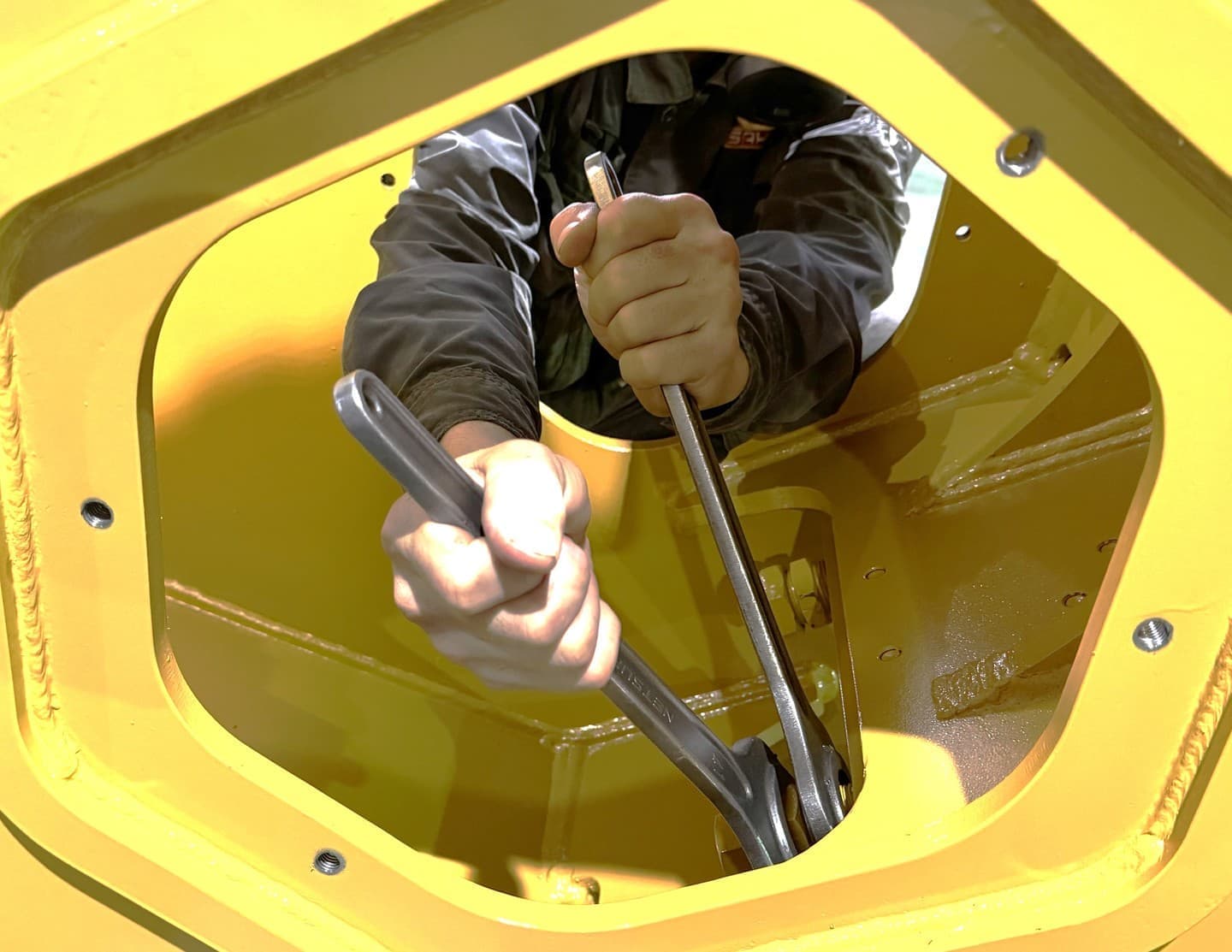 現場でのホース交換をよりスムースにするために点検口を広げました。両腕が入るので組付けしやすく、パイプで延長したスパナも楽に締められます。側板自体は厚みを増やして強度を維持しました。